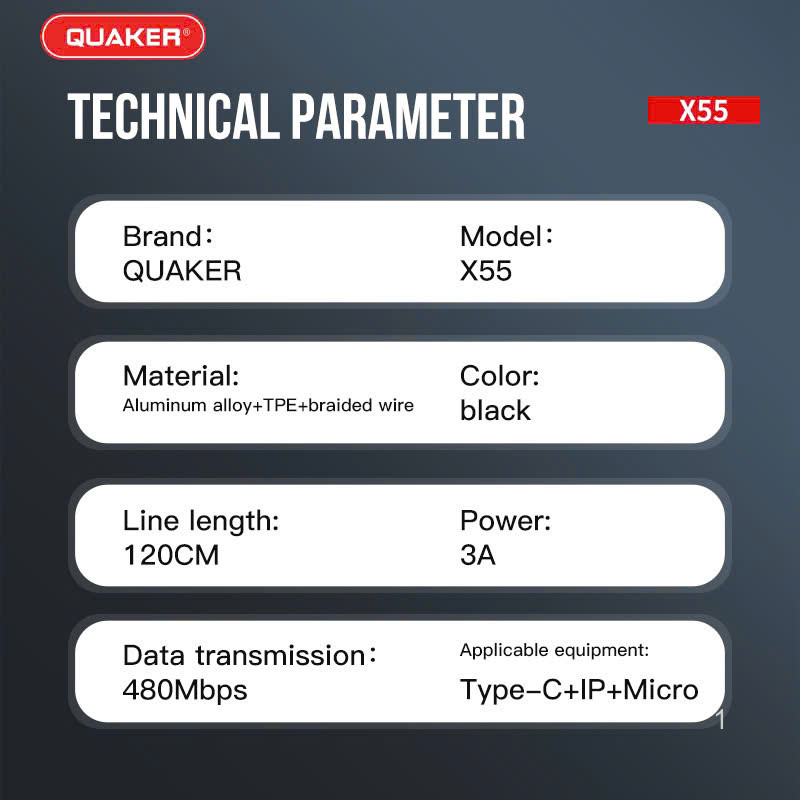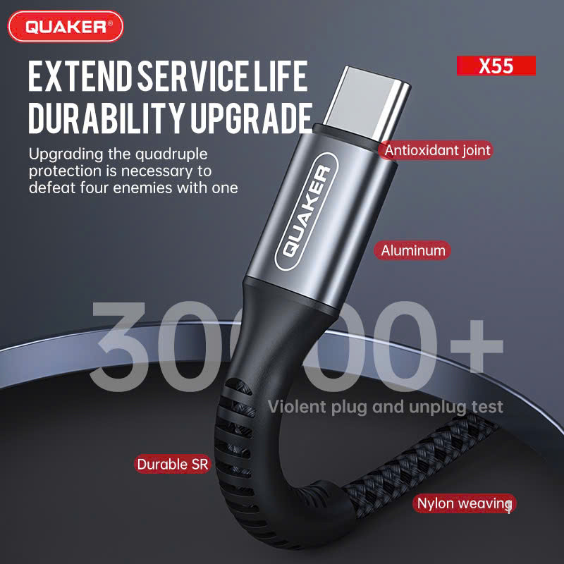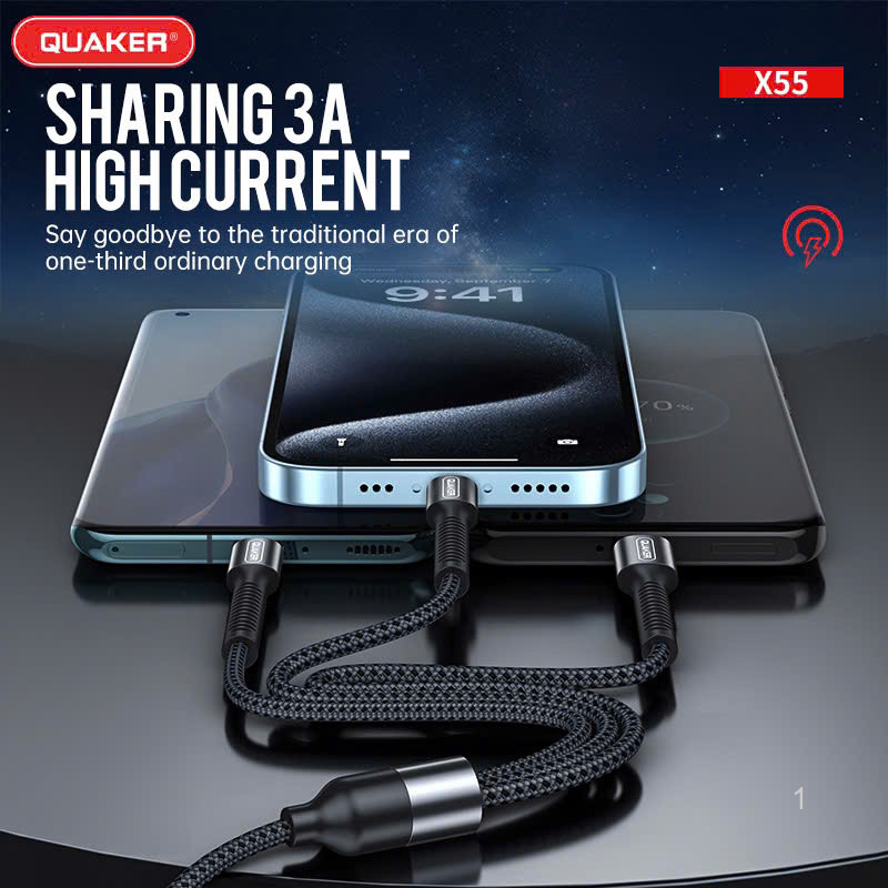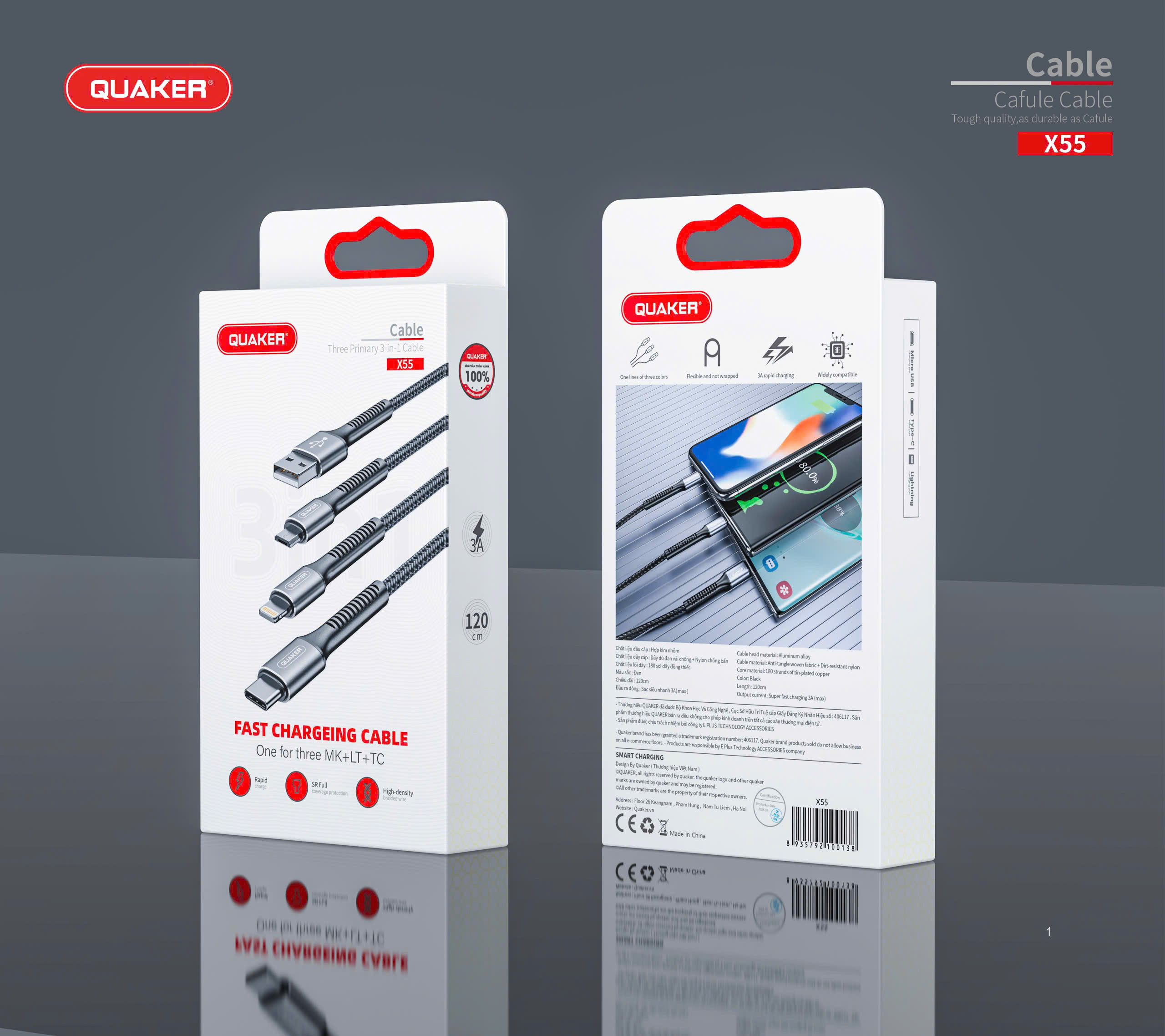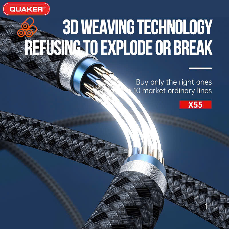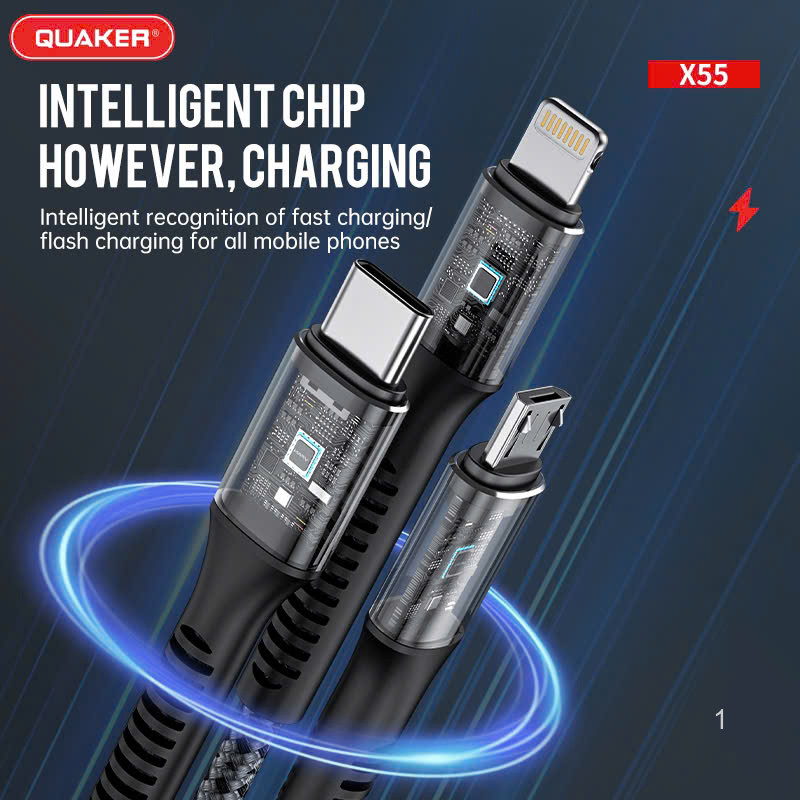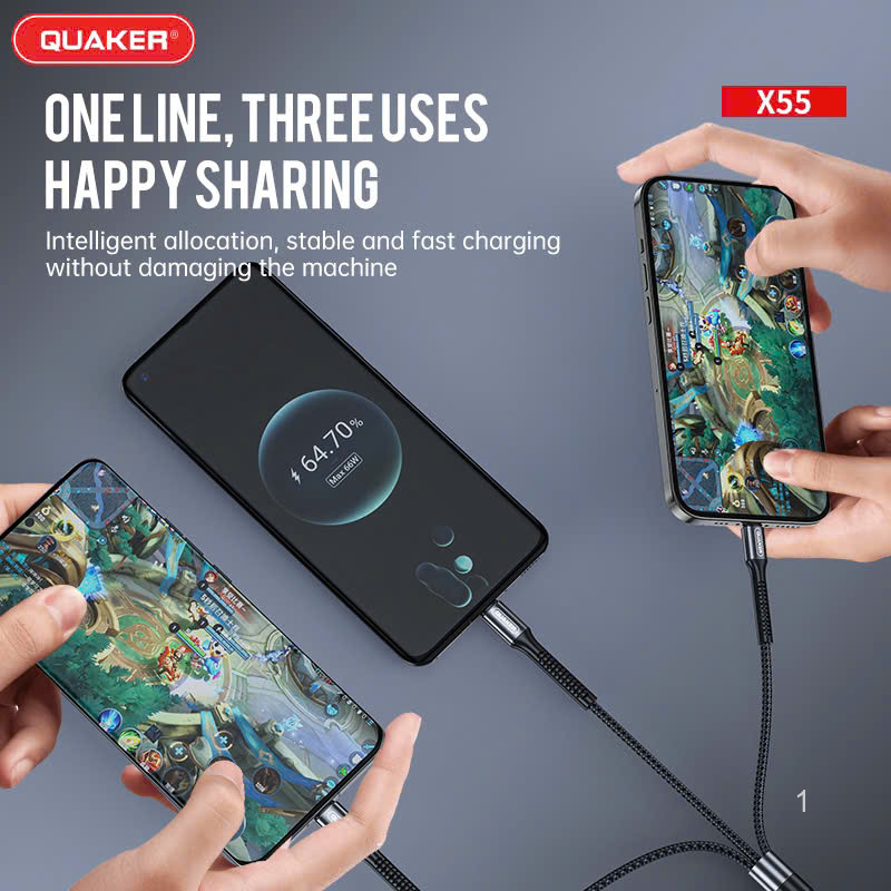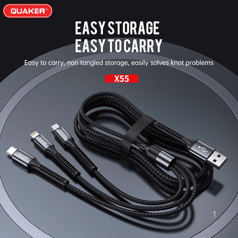 Cáp Dù Quaker 3in1 X55 là lựa chọn hoàn hảo cho người dùng cần một sợi cáp đa năng, bền chắc và hỗ trợ sạc nhanh. Với 3 đầu sạc Lightning, Micro USB và Type-C, sản phẩm cho phép bạn sạc cùng lúc 3 thiết bị mà vẫn đảm bảo tốc độ ổn định.