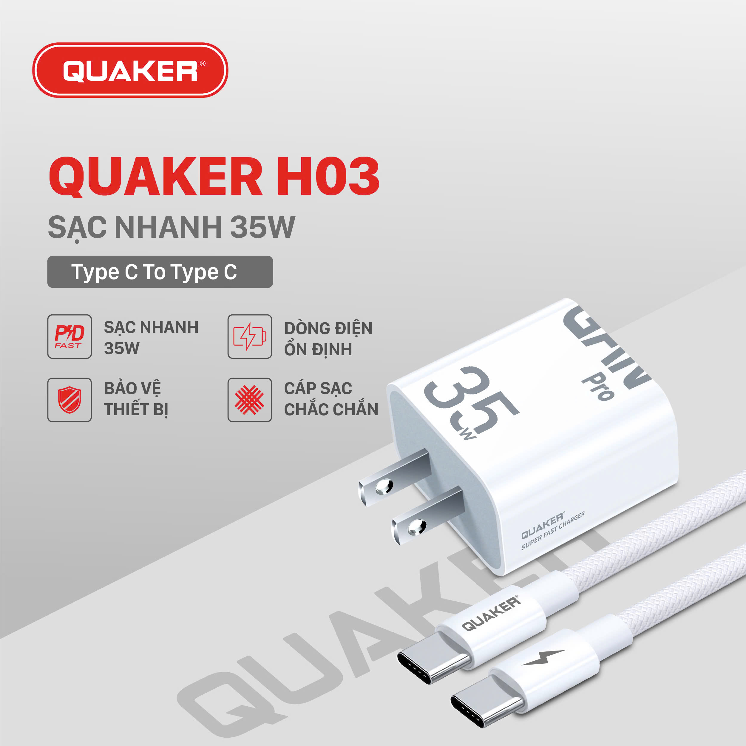 Quaker H03 US ứng dụng công nghệ GaN (Gallium Nitride) tiên tiến, giúp giảm kích thước 30% so với sạc truyền thống, vẫn đảm bảo công suất mạnh mẽ, sạc nhanh, tỏa nhiệt ít và tiết kiệm điện. Bộ sạc đi kèm cáp Type-C to Type-C chất lượng cao, lõi to chắc chắn, hỗ trợ dòng sạc tối đa 100W và truyền dữ liệu tốc độ cao, đảm bảo kết nối ổn định, an toàn cho mọi thiết bị.